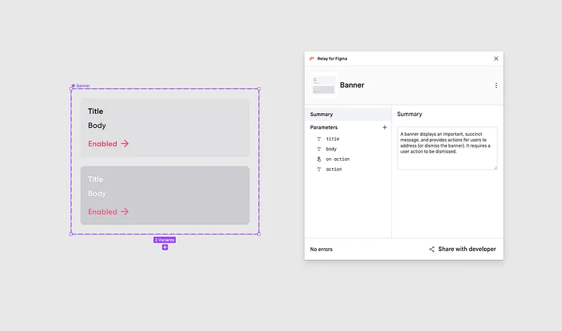 We started in Figma, packaging the component up into light and dark mode variants, and assigning parameters to the things we want developers to be able to control. We found that a lot of parameters were already half-way filled out, with field-types in Figma being used to divine which types the parameters should be. Neat!
