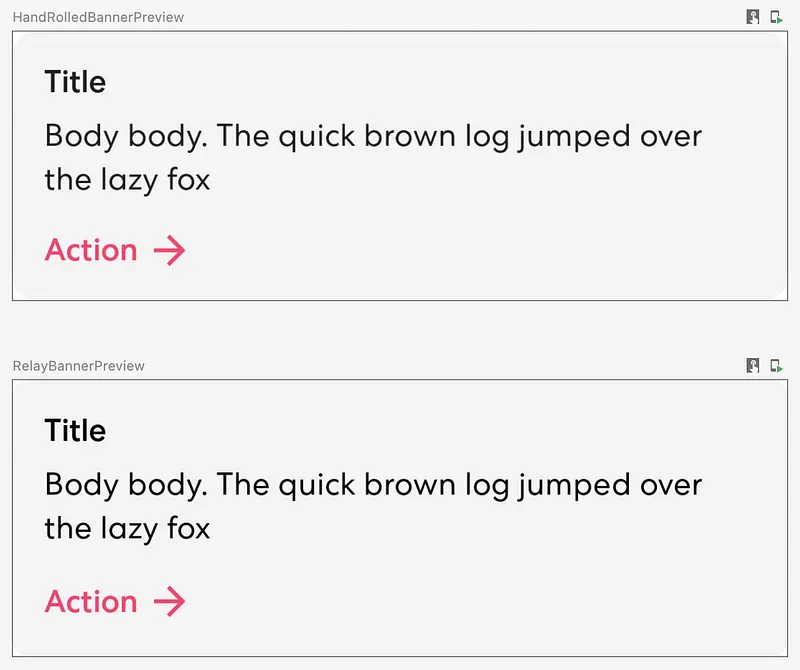 We then dropped the generated banner into a @Preview, and checked it out alongside our hand-rolled implementation.